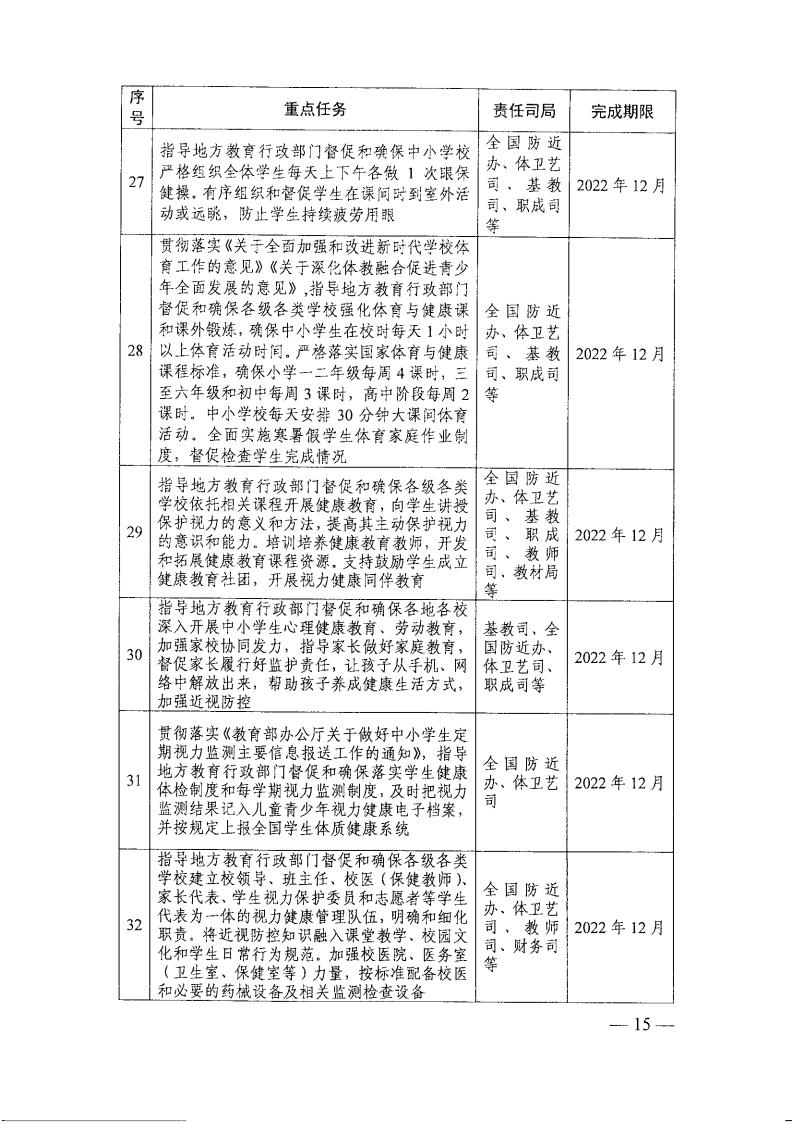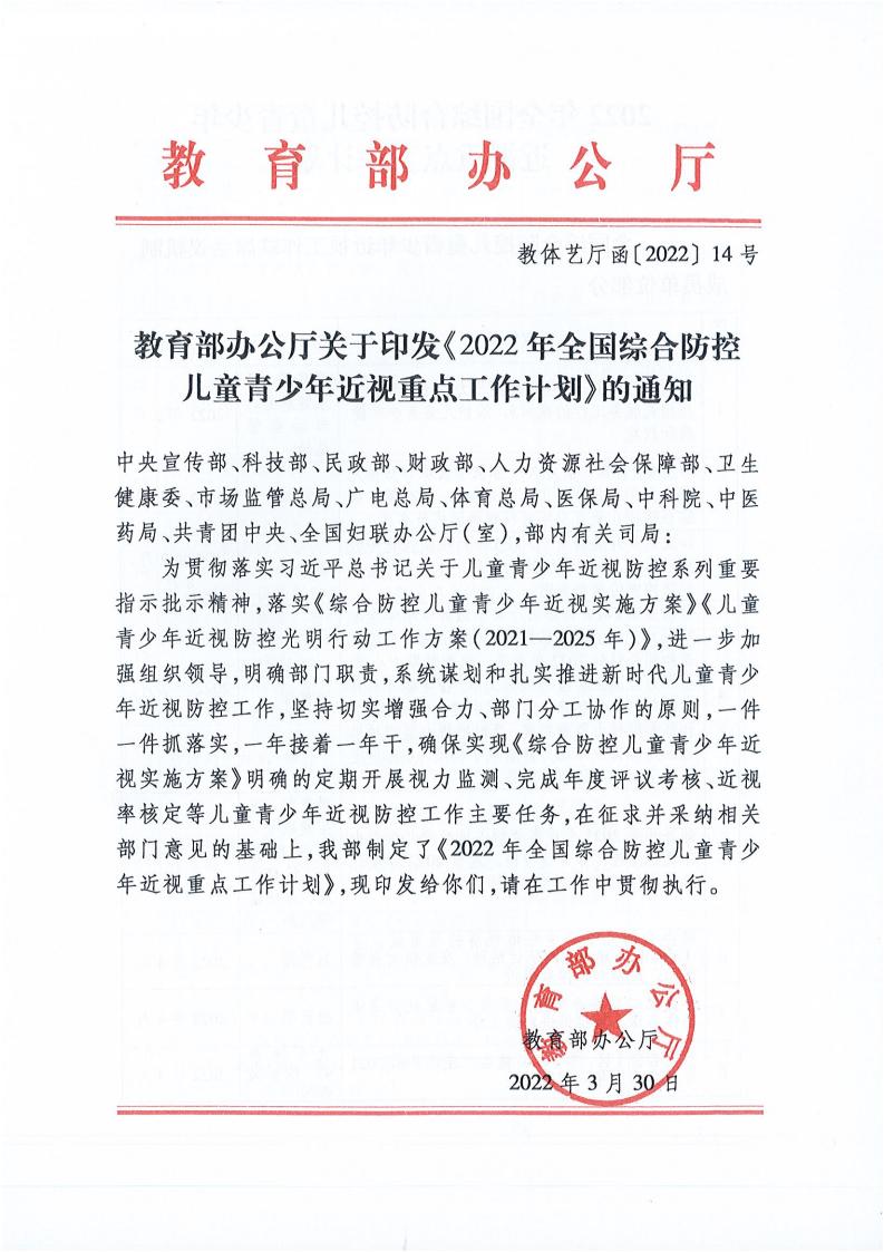教育部办公厅关于印发《2022年全国综合防控儿童青少年近视重点工作计划》的通知(教体艺厅函[2022]14号)