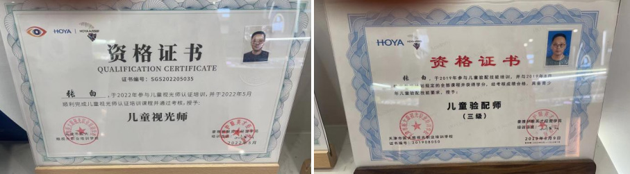 2022年8月,在获得近视防控服务认证之后,公司更注重专业技术人员培养,经常参加国内外眼镜专业技术培训并获得多项资格证书,自费参加了专项针对儿童视健康培训的《儿童视光师》和《儿童验配师》资格培训班,并参加了天津眼视光培训学校举办的调节与训练专项课程,不但让整个团队了解了近视防控的重要作用及整体方案,更实际的是对儿童近视防控的服务质量产生了很大的促进作用。